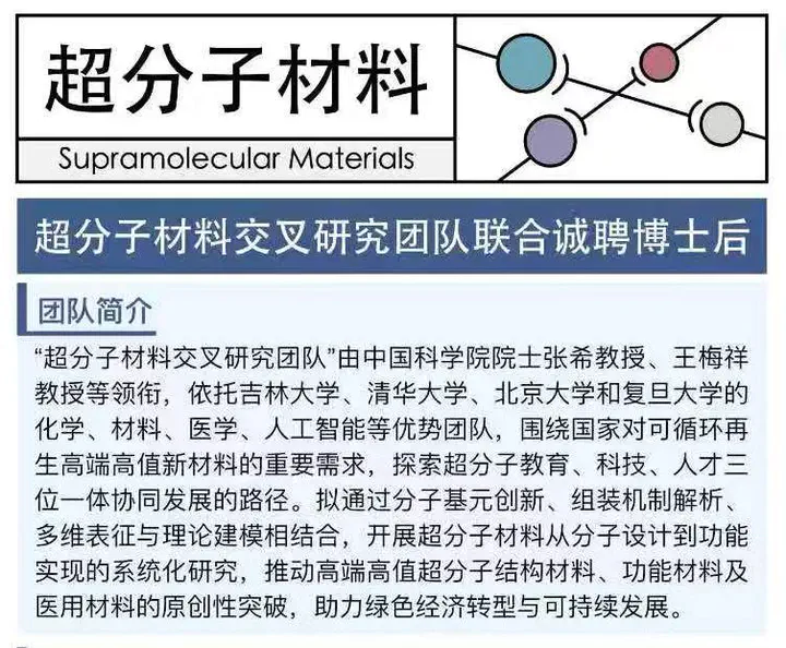 超分子材料交叉研究团队现开启2026-2030年长期博士后招聘。